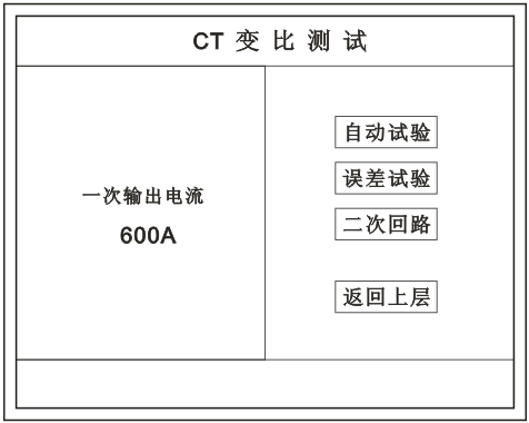在主菜單界面,旋轉鼠標將光標移動到 CT測試 選項上,按下旋轉鼠標選擇 CT變比 即可進入變比極性試驗設置界面(如下圖)。光標移動至 返回上層 ,按下鼠標即可返回主菜單。