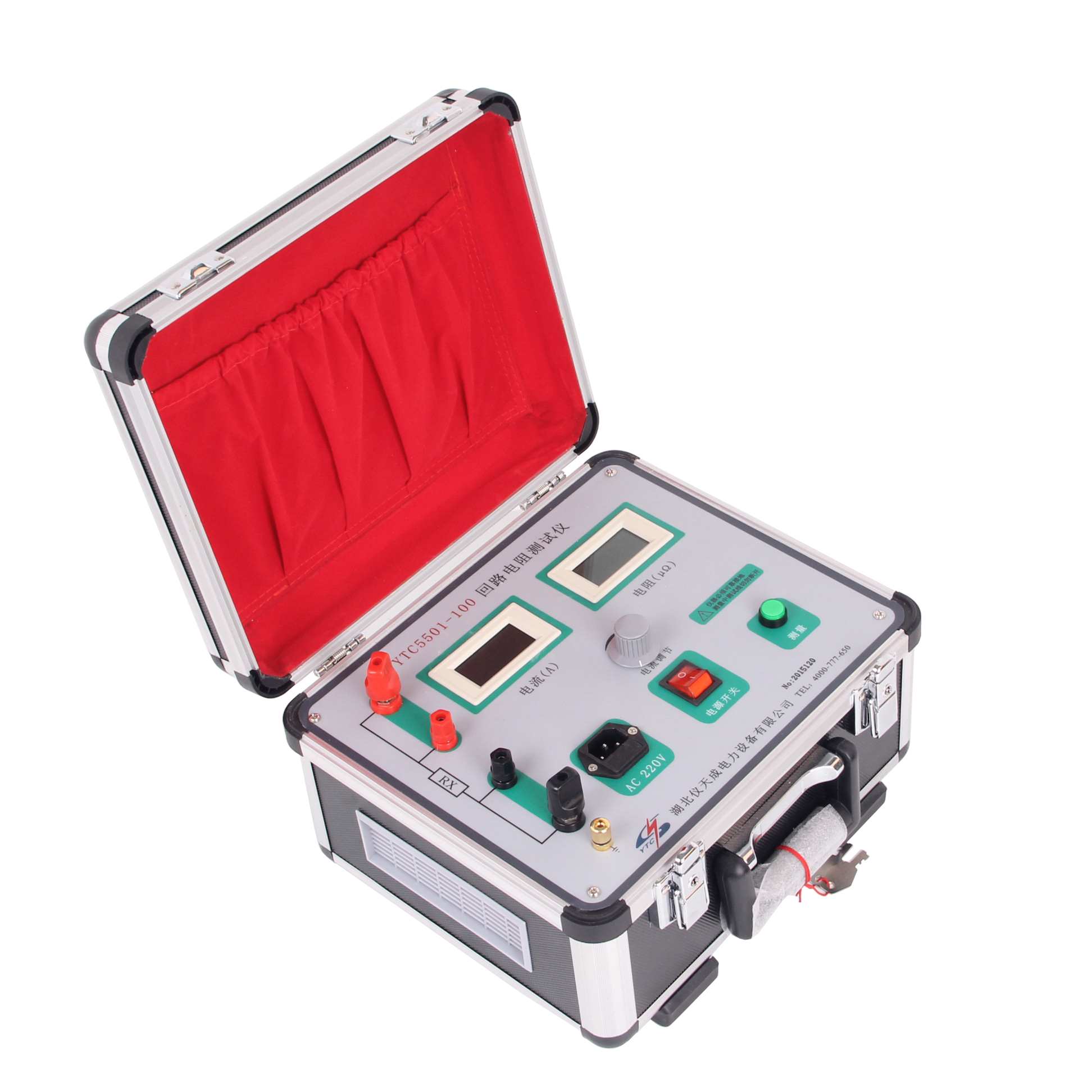 2. 按下測量開關,調節電流調節旋鈕,使電流升至100A,此時電阻表的顯示值即為被測接觸電阻值。補充說明:若顯示屏顯示“1”,表明被測回路電阻值超出量程;若實際測量電流未達到100A(設實際電流為Io,對應電阻表顯示值為Uo),則實際電阻值計算公式為:R =(100×Uo÷Io)μΩ。