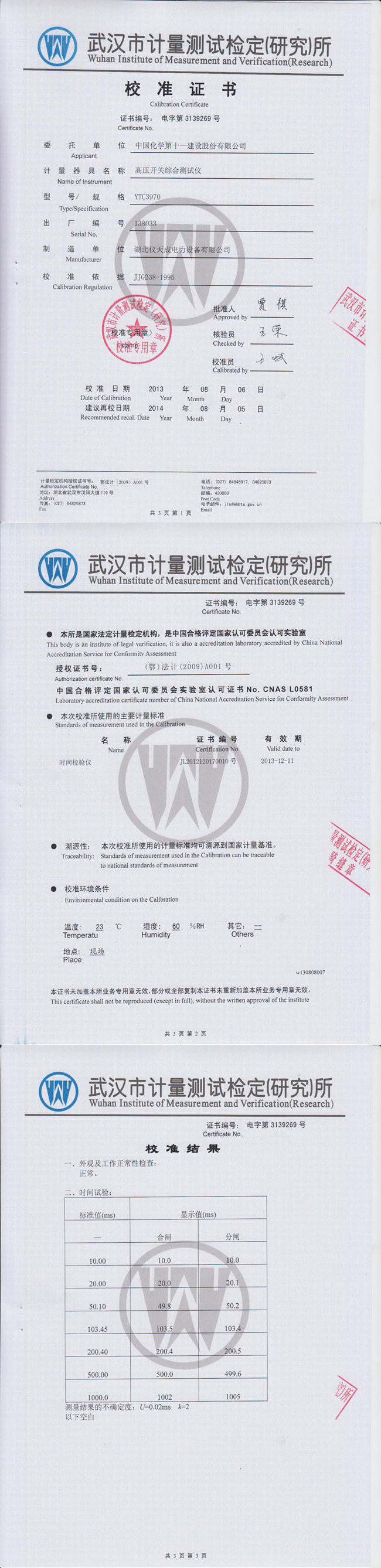 YTC3970高壓開關(guān)動(dòng)特性測(cè)試儀鑒定證書