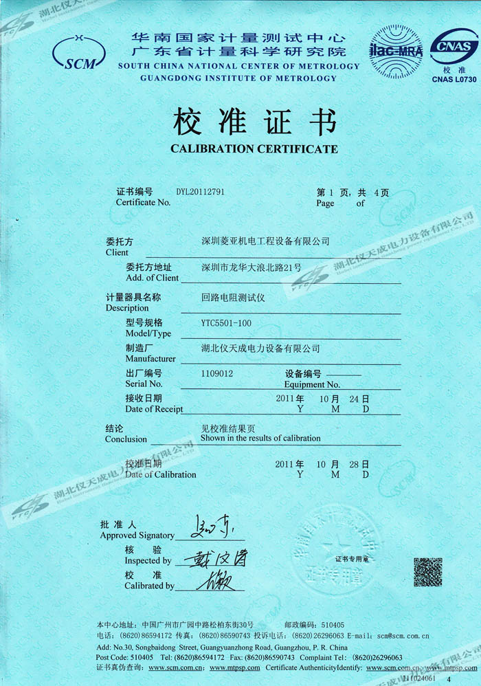 轉(zhuǎn)載:"YTC5501-100A 回路電阻測試儀的資質(zhì)證書" 請注明來源于儀天成電力。 更多技術(shù)問題請致電儀天成電力客戶服務(wù):027-87876585,技術(shù)部專線:027-87876585,在線客服:719388481